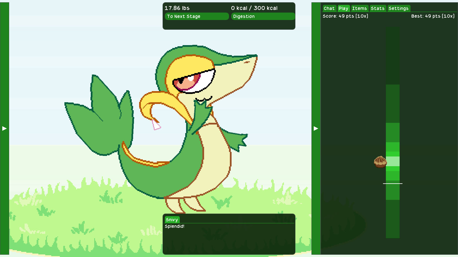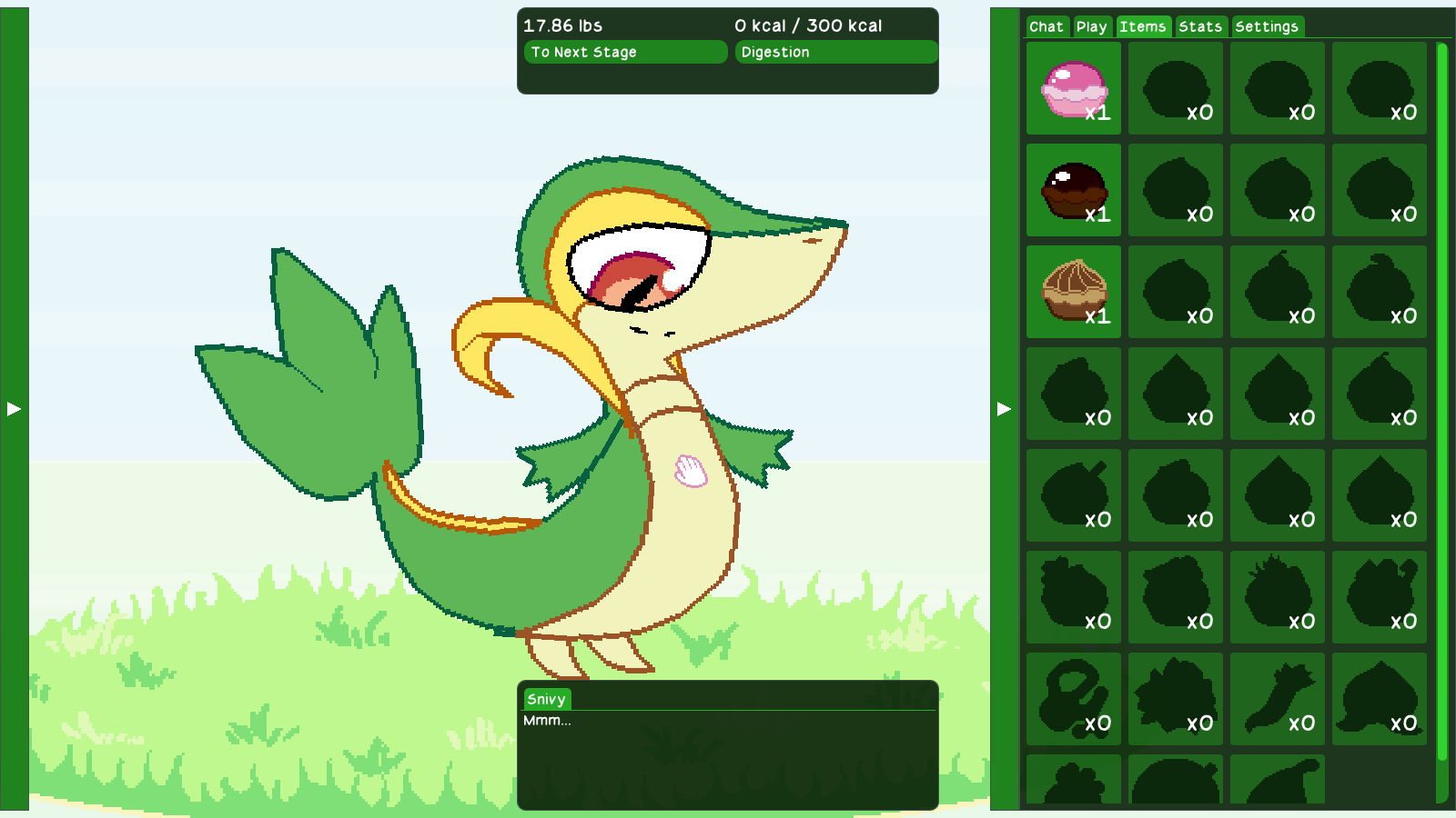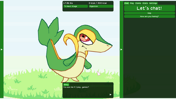 I absolutely adored what I played. I managed to get this beautiful Snivy to "max size"... for now, I hope! You're after my own heart by making this Snivy as much of a blubberbeast as me, I definitely feel kinship with this cutie because I too think deeply about feederism and what it means to me. Loved the dialogue and the surprisingly fun mechanics with the stomach capacity, there is a legit meta game here.
